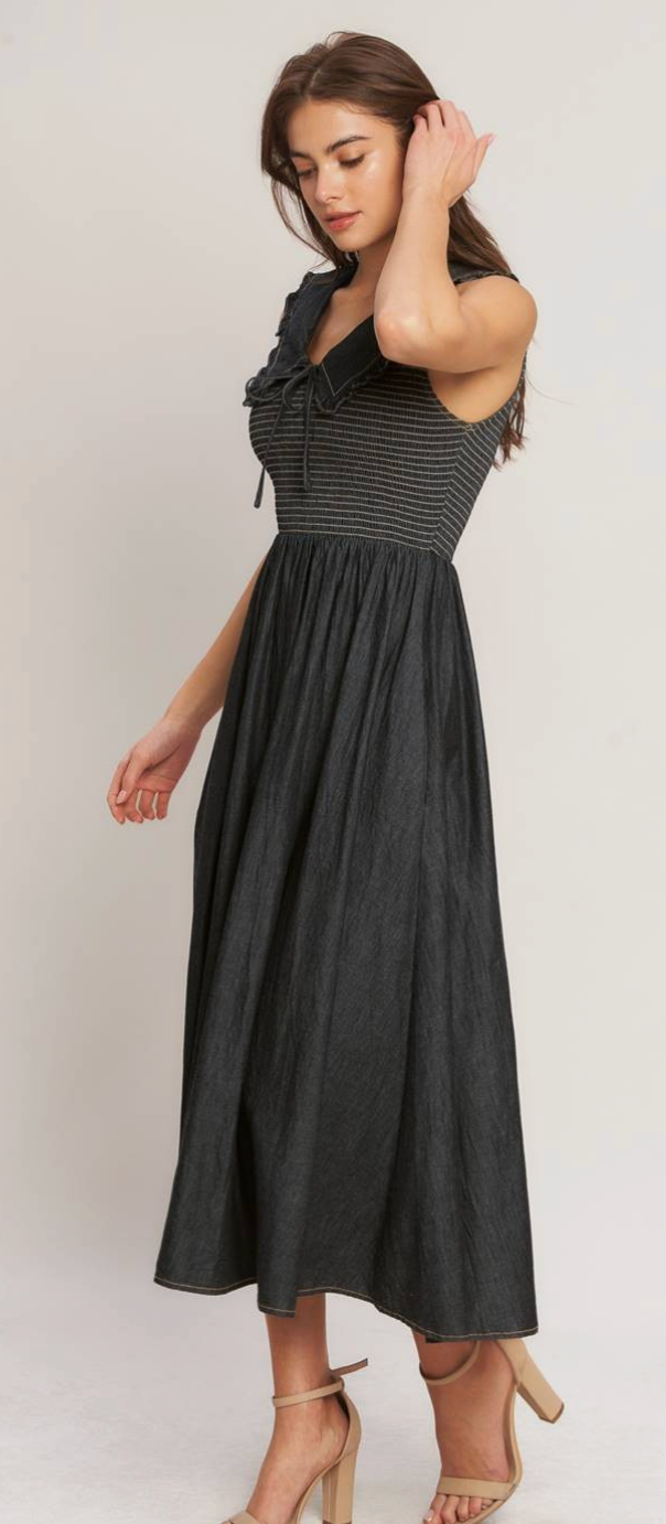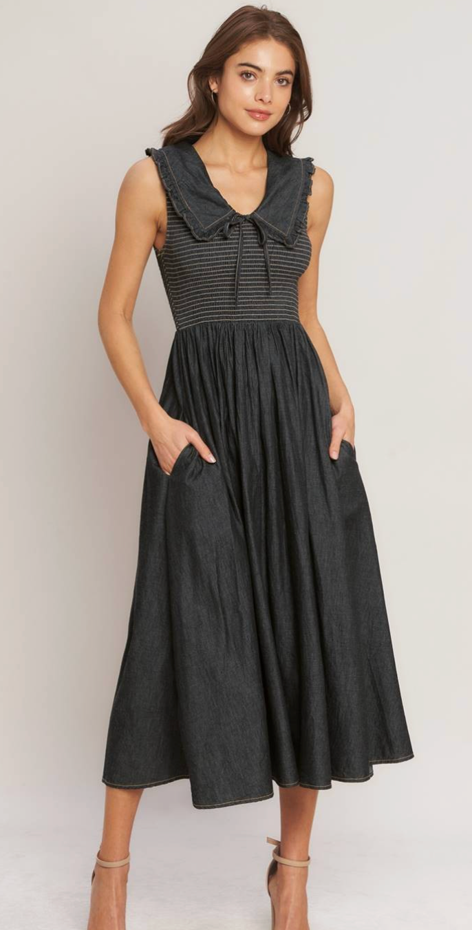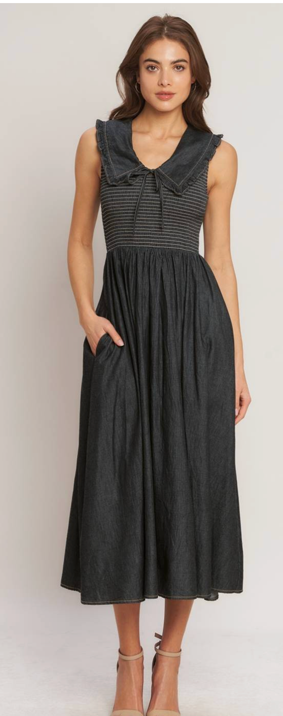 Dark Denim Smocked Dress w/Ruffled Collar & Pockets - Slightly Generous - M is backordered and will ship as soon as it is back in stock.