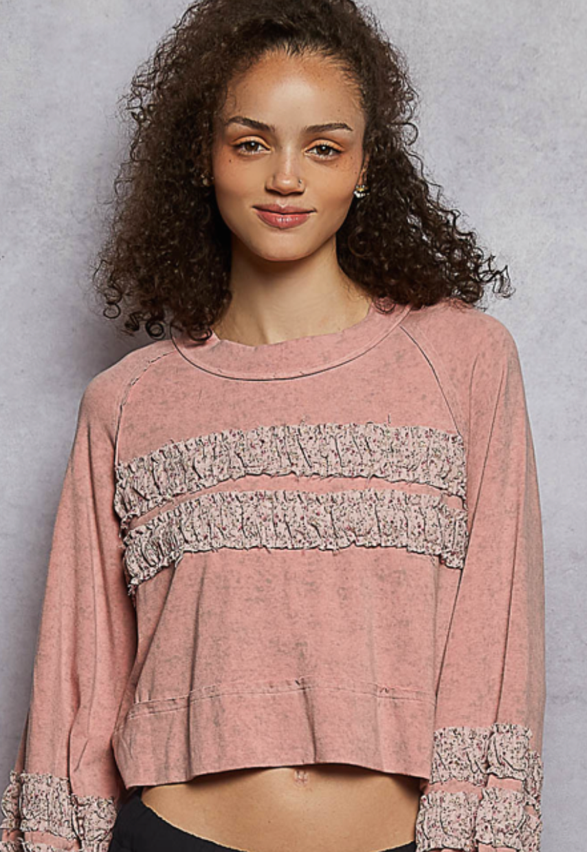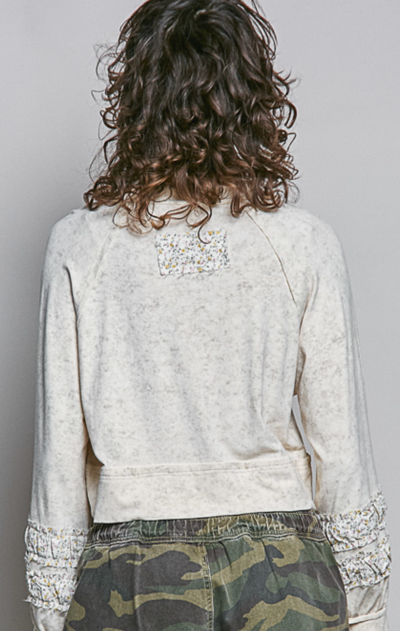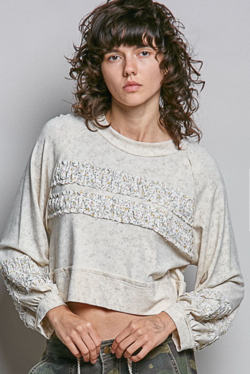 Adorable Top w/Floral Ruffle Details - 2 Colors - Generous Fit - Oatmeal Small is backordered and will ship as soon as it is back in stock.