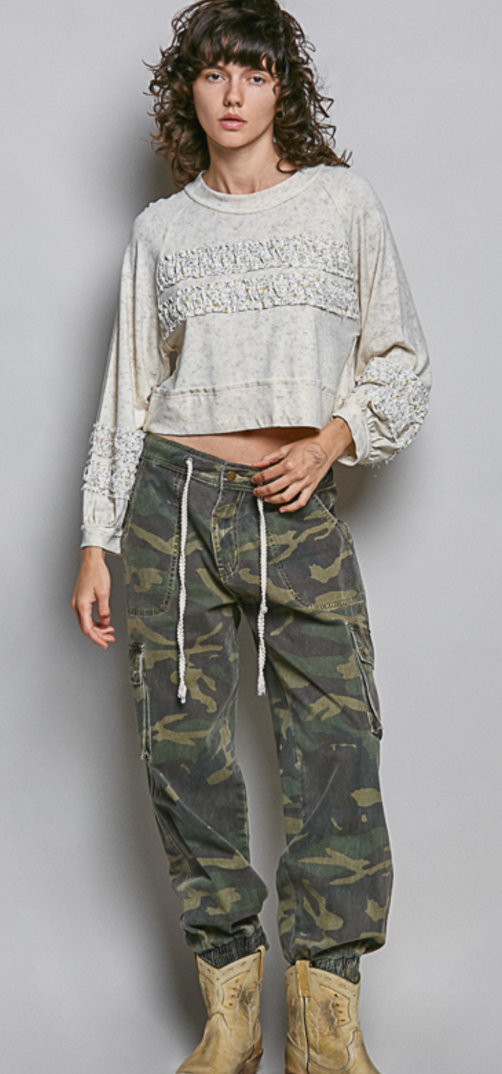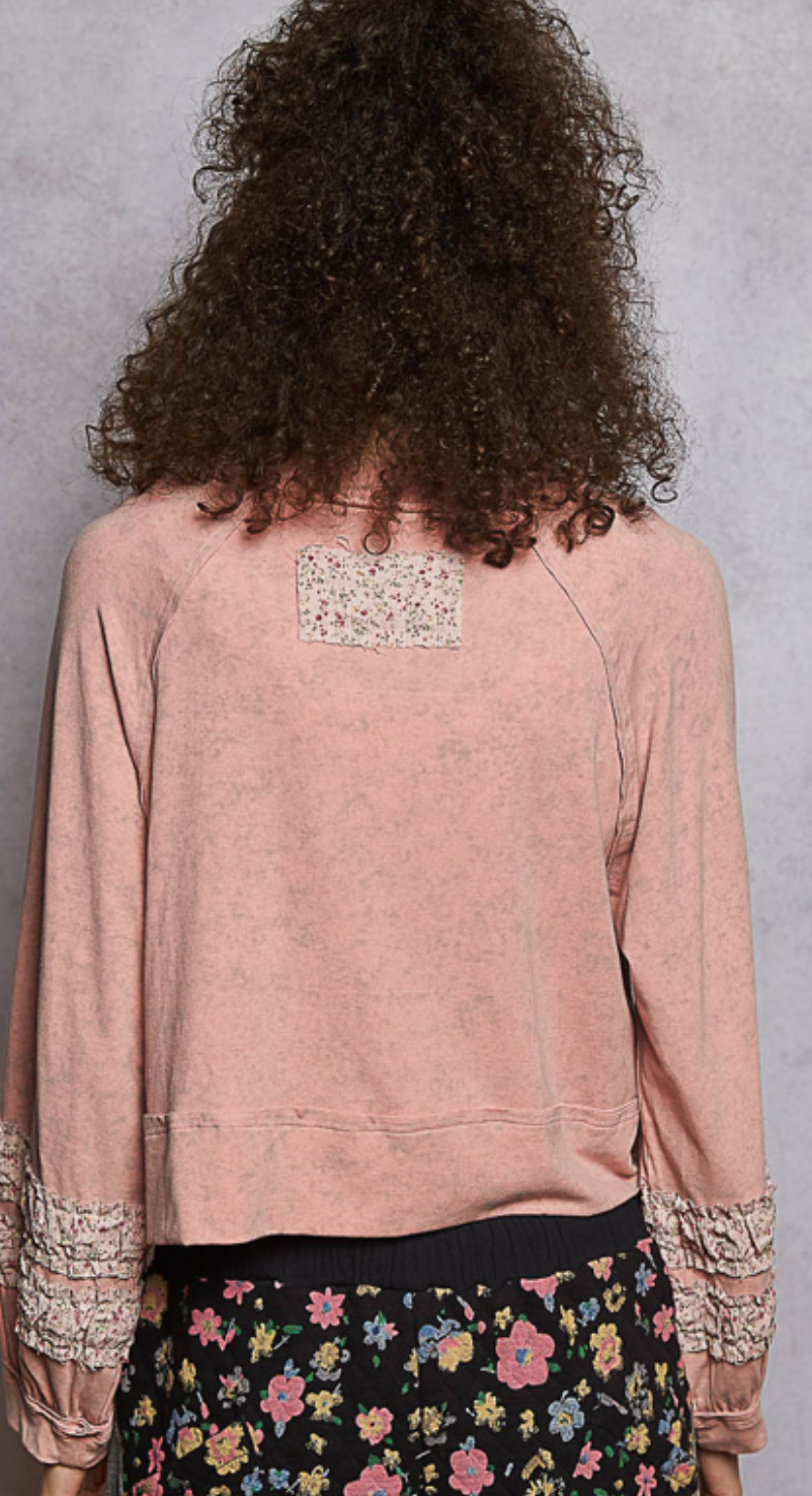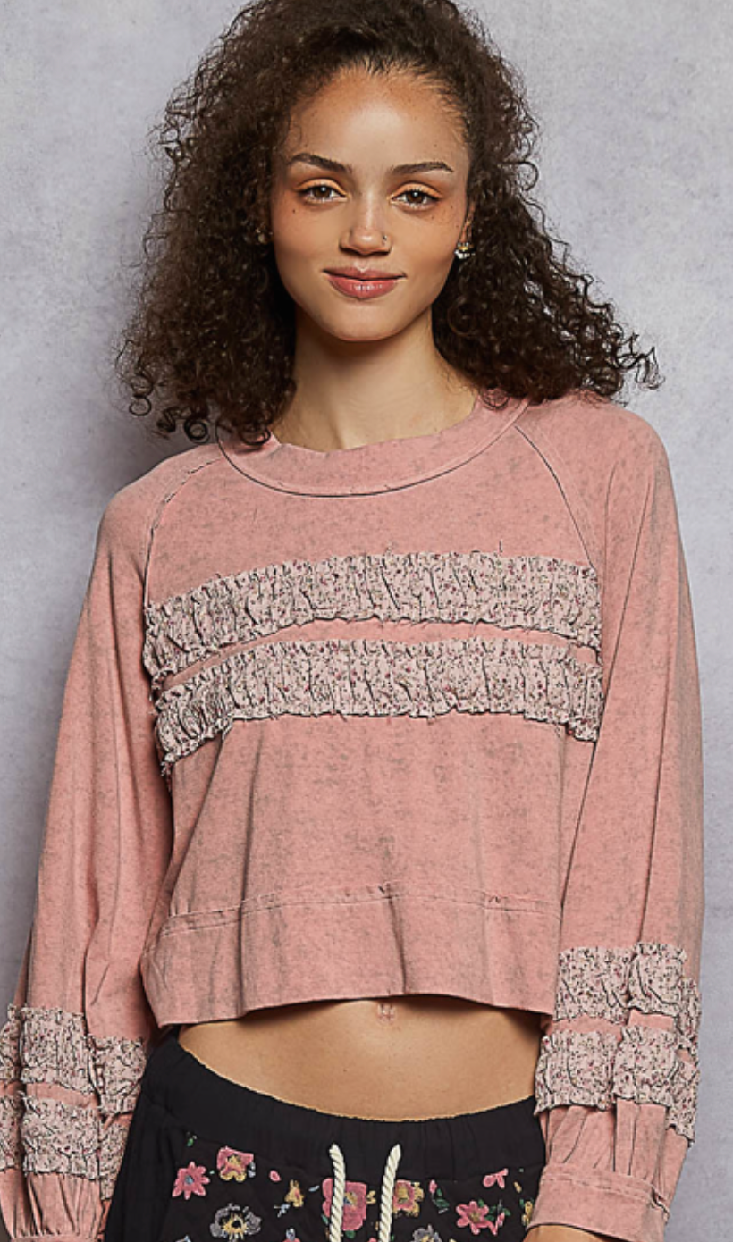Adorable Top w/Floral Ruffle Details - 2 Colors - Generous Fit - Oatmeal Small is backordered and will ship as soon as it is back in stock.