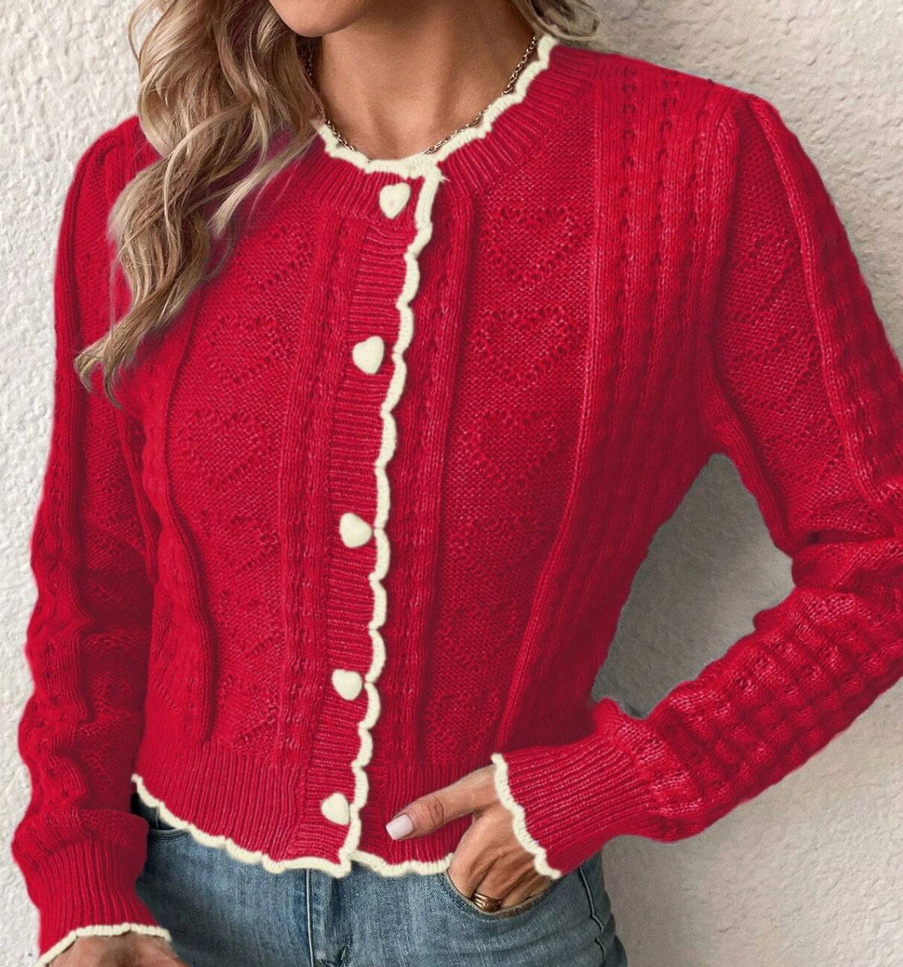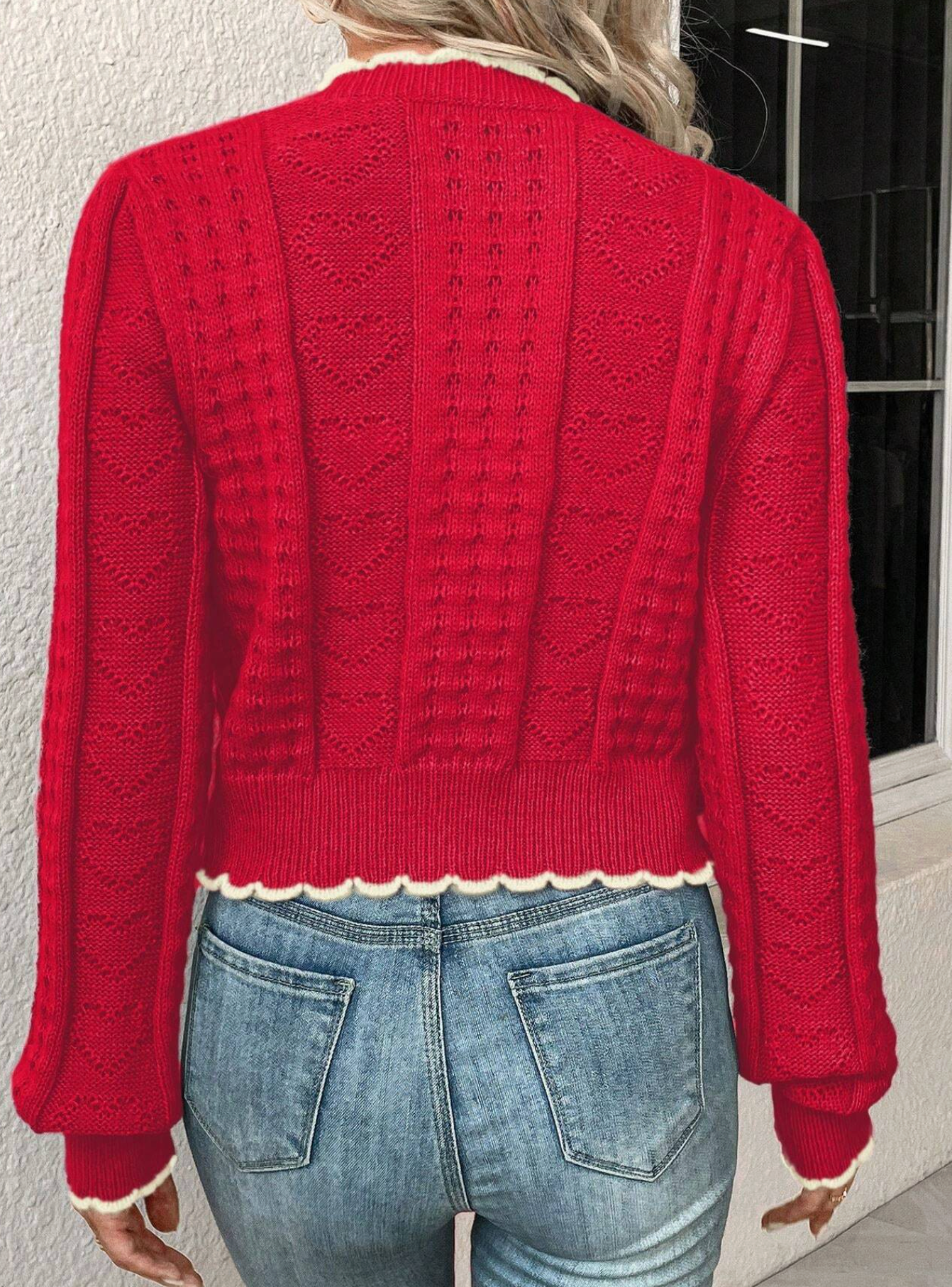 Cropped Red Sweater w/White Scalloped Edges & Heart Buttons - True Fit - Arrives 3/31- Small is backordered and will ship as soon as it is back in stock.